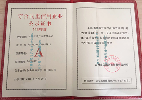 2015年度守合同重信用企業(yè)公示證書